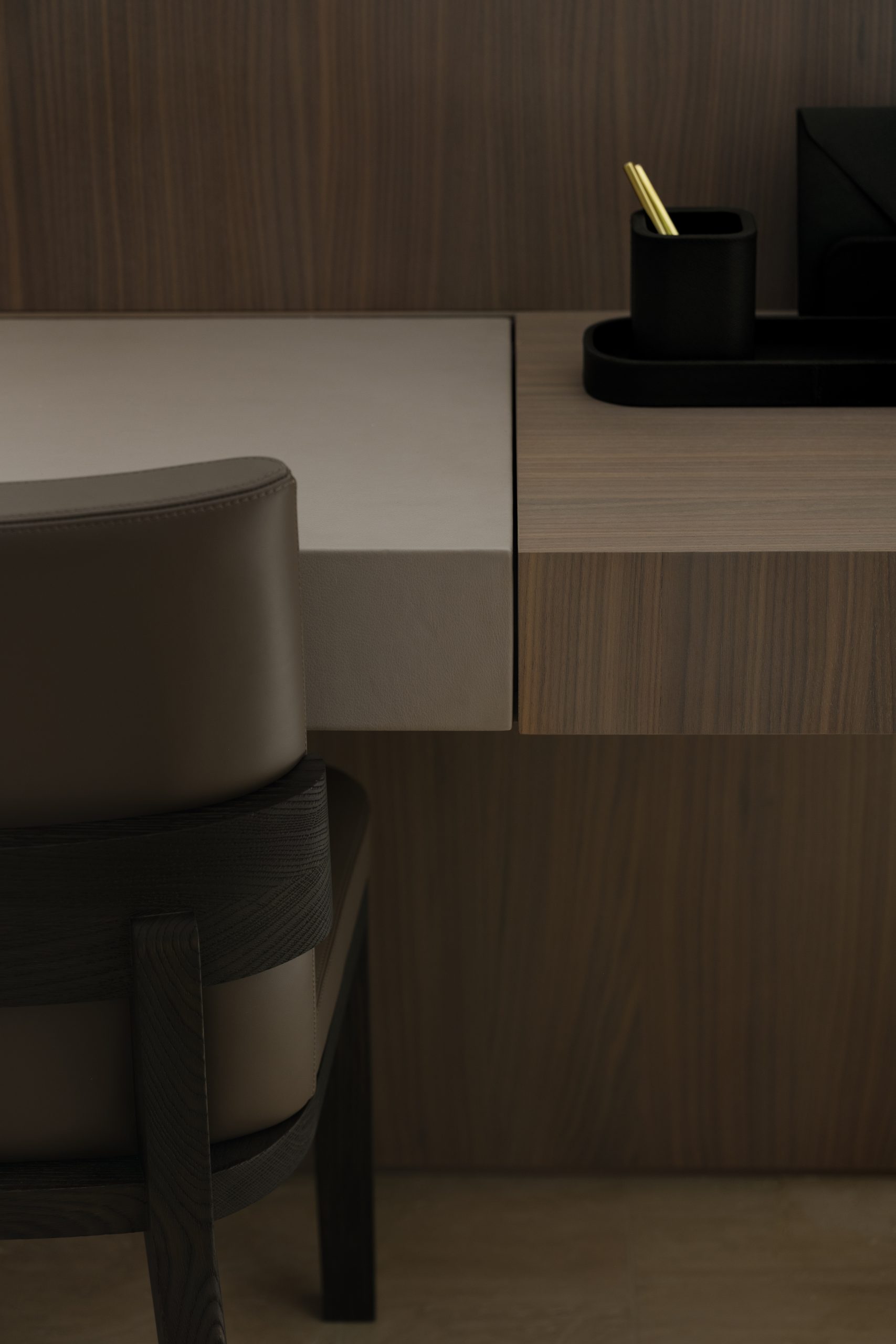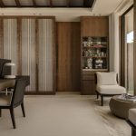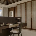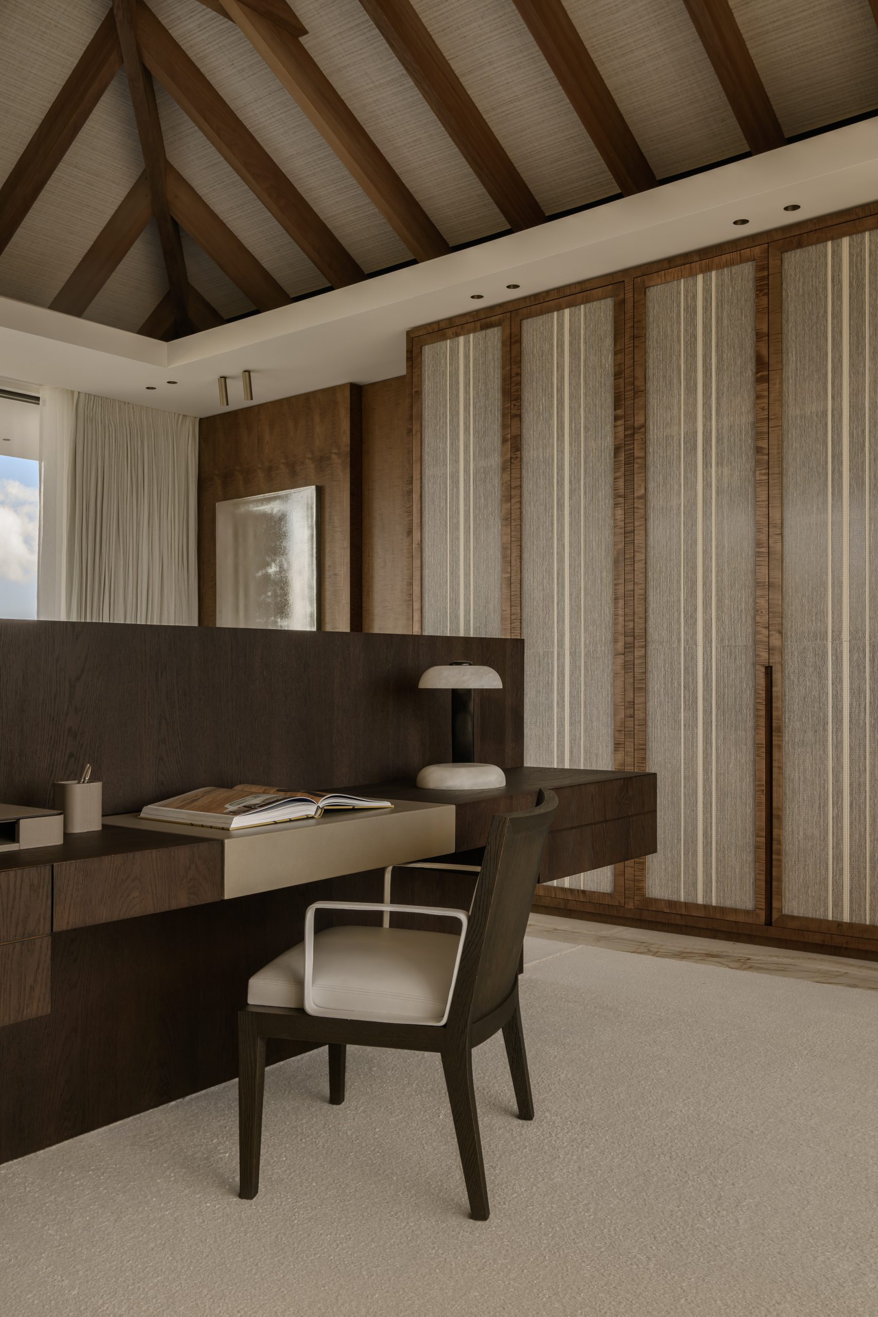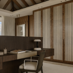 Ce travail de cuir tissé, intégré aux surfaces vitrées, crée un jeu subtil de textures et de lumière qui s’inscrit parfaitement dans l’esthétique raffinée des villas, apportant chaleur, élégance et caractère aux espaces intérieurs.
